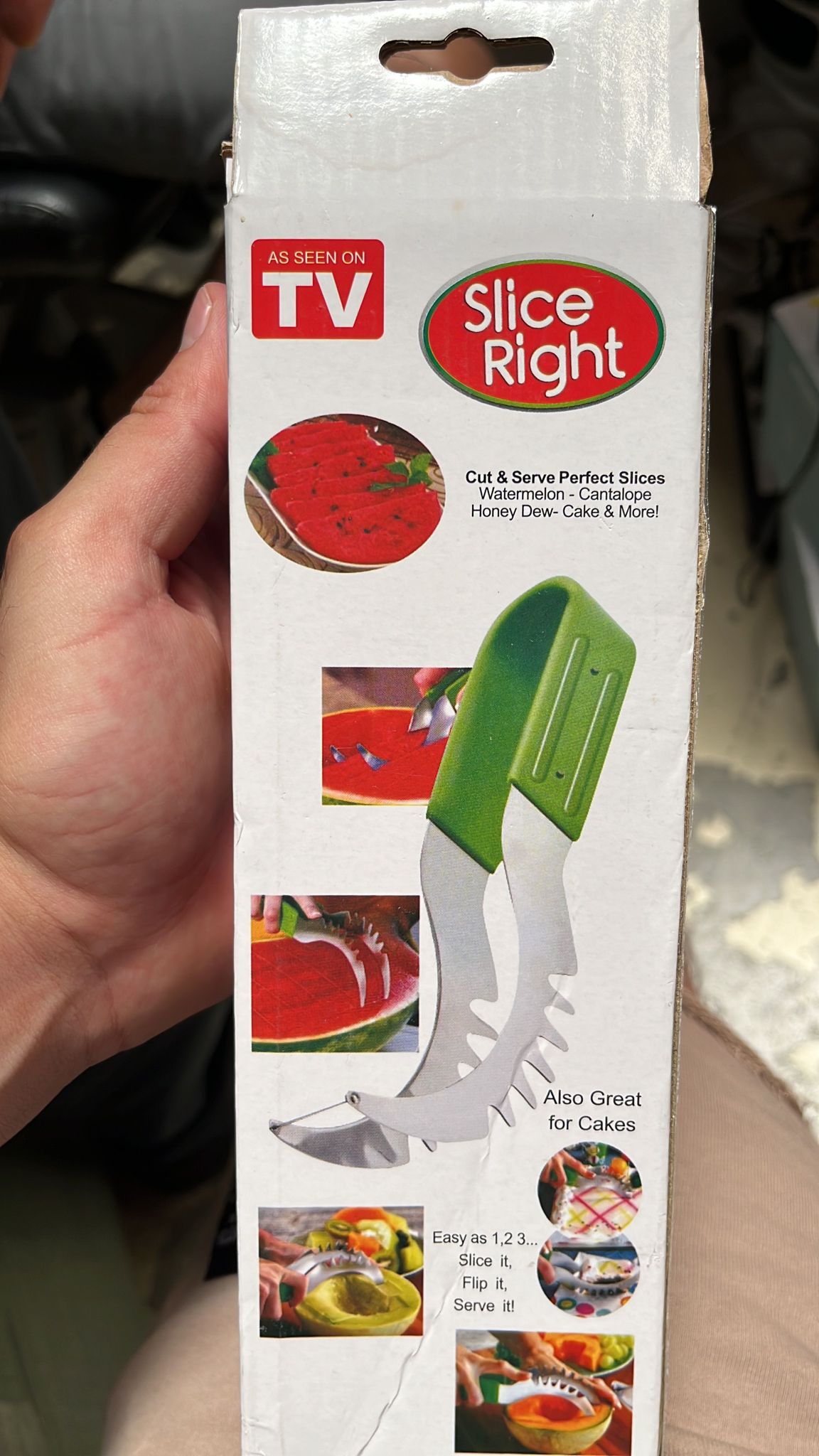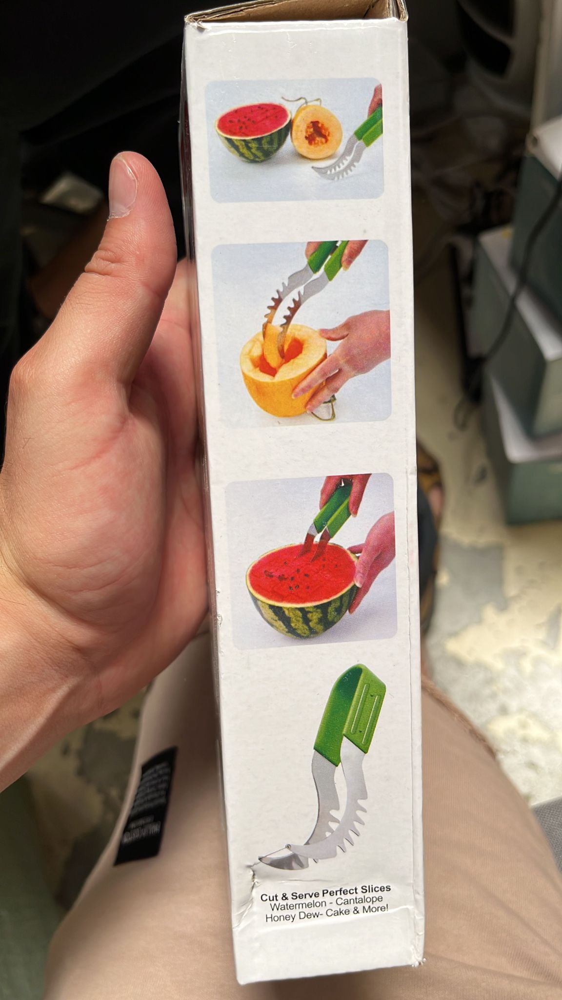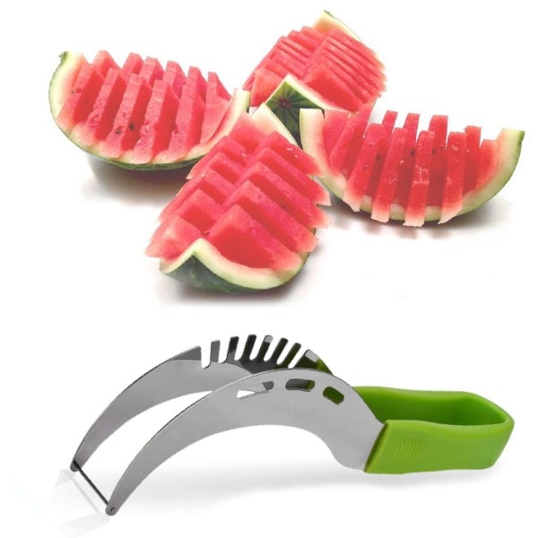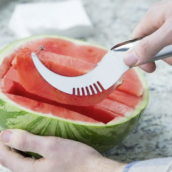 un cuțit curbat vă permite să tăiați fructele în felii dorite, fără a atinge fructele și fără a fi nevoie să vă spălați pe mâini. Două lame ascuțite din oțel inoxidabil vă permit să tăiați pepenele verde în mai multe moduri diferite. Blatul dumneavoastră de bucătărie va fi curat pentru că nu este necesar să tăiați pepenele verde cu un cuțit obișnuit care poate face mizerie și cu care riscați să vă tăiați.