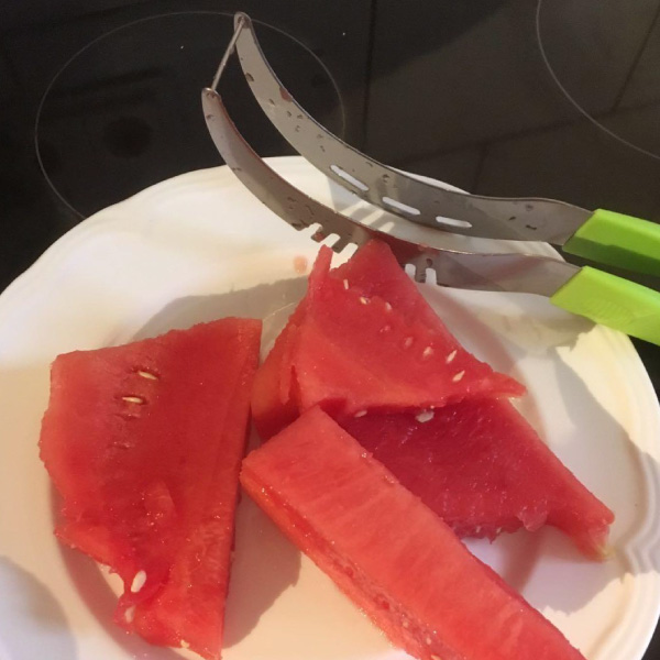 - Cuțitul este conceput pentru a tăia pepenele verde în felii uniforme și drepte. După tăiere, prindeți fiecare felie cu cleștele, luați din pepene și serviți ușor pe o tavă. Excesul de suc va rămâne în partea de jos a pepenelui, astfel încât sucul din fructe nu va rămâne pe farfurie și pe blatul din bucătărie.