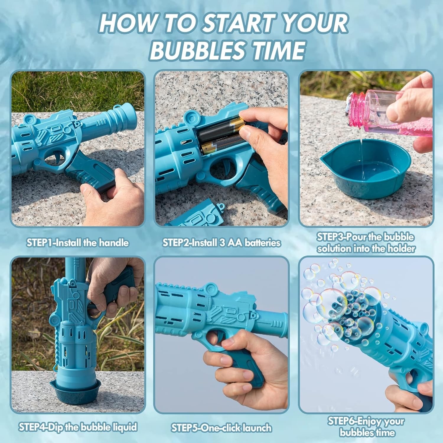 Pistolul este foarte simplu de utilizat. Asezati bateriile conform semnelor din lacasul special, asezati vasul din pachet pe o suprafata plana, turnati o cantitate mica de lichid, apropiati capatul cu orificii al pistolului apoi ridicati in aer si apasati butonul pentru a impusca cu baloane.