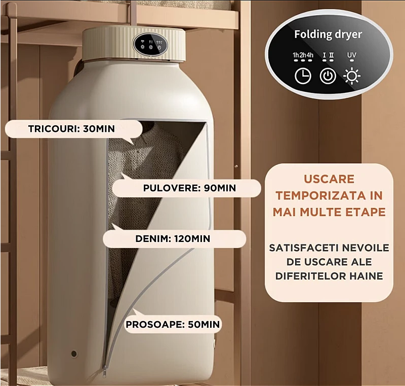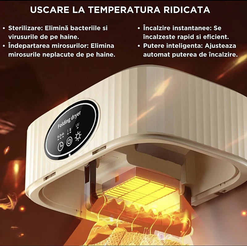 Uscator de rufe de ultima generatie: Curatenie, eficienta energetica si ingrijire delicata pentru hainele taleEsti mereu pe fuga si ai nevoie de haine care se usuca rapid? Esti ingrijorat de bacteriile si acarienii care pot ramane pe haine dupa spalare? Vrei un uscator de rufe care sa fie bland cu tesaturile tale pretioase si sa te ajute sa economisesti bani la factura de energie? Atunci acest uscator de rufe de inalta performanta cu tehnologie de ultima ora este perfect pentru tine!Usor de igienizat si delicat cu haine:Tehnologie de uscare la temperatura inalta: elimina 99,9% dintre bacterii, virusi si acarieni, oferind o curatare profunda hainelor tale. Ideal pentru familiile cu copii mici, alergici sau persoanele care doresc o igiena superioara.Control precis al temperaturii: Selectati temperatura perfecta pentru fiecare tip de tesatura. De la bumbac la delicate, hainele tale vor fi uscate perfect, fara riscul de deteriorare.Uscare temporizata in mai multe etape: Selectati timpul de uscare perfect pentru fiecare incarcatura. Puteti chiar seta mai multe etape cu temperaturi diferite pentru uscarea optima a diferitelor tipuri de haine.Circulatie de uscare la 360°: hainele dumneavoastra se vor usca uniform, fara zone umede sau cute inestetice.