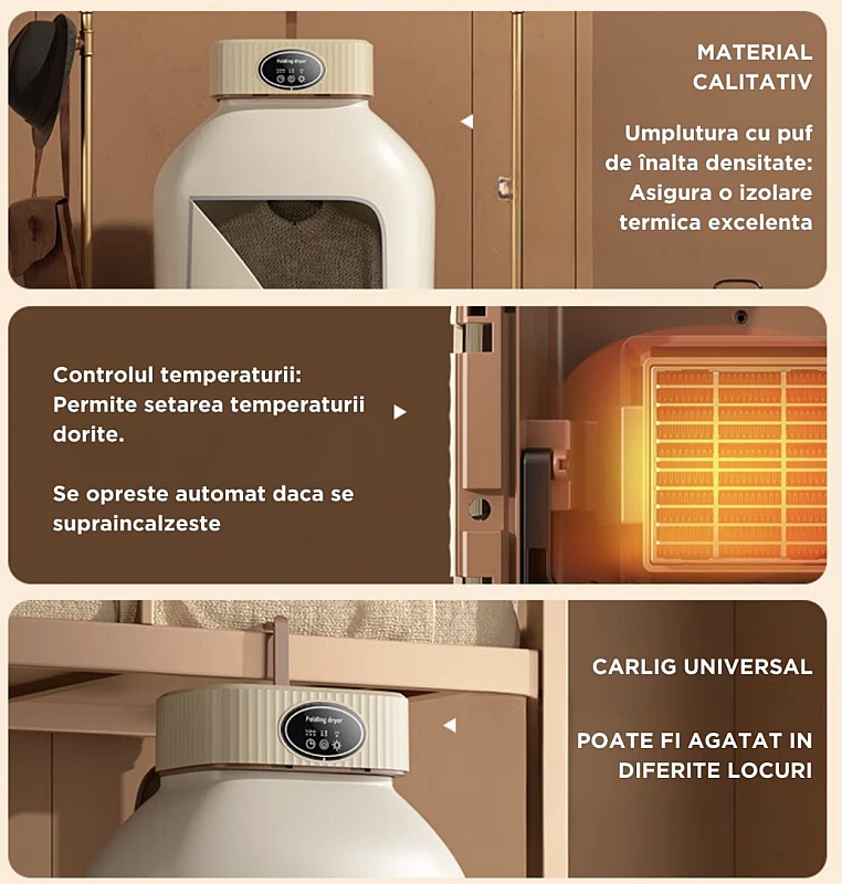 Incalzire rapida PTC: tehnologia PTC ofera o incalzire rapida si eficienta, economisind timp pretios si reducand consumul de energie.Protectie impotriva supraincalzirii: nu trebuie sa va faceti griji pentru siguranta. Uscatorul se opreste automat daca se supraincalzeste.Economisiti bani si aveti grija de mediu: acest uscator este conceput pentru a fi eficient din punct de vedere energetic, ajutandu-va sa economisiti bani la factura de energie electrica.Capacitate mare de 10 kg: Usca o cantitate mare de haine intr-un singur ciclu, economisind timp si energie.Motor puternic de 1500W: Ofera o uscare rapida si eficienta pentru toate nevoile tale.Design elegant din otel inoxidabil: Se potriveste perfect cu orice decor din baie sau camera de spalatorie.Panou de control intuitiv: Usor de utilizat, cu butoane clare si un display digital usor de citit.Acest uscator de rufe este ideal pentru:Familii cu copii mici: igienizati hainele pentru ingrijire sanatoasa.Persoanele cu alergii: Eliminati acarienii pentru o respiratie mai usoara.Oameni ocupati: usuca rapid hainele, economisind timp pretios.Oameni ecologici: consuma mai putina energie si ajuta la protejarea mediului - Recenzii