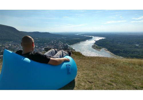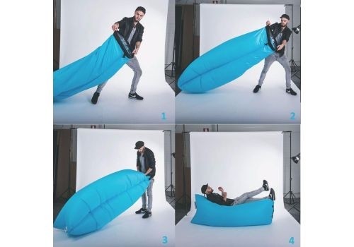 Saltea gonflabila Lazy Bag. Salteaua are 2 camere, acoperite in interior cu o folie groasa, care nu permite aerului sa treaca. Pentru a umfla salteaua trebuie doar sa prindeti aerul – actiunea este foarte simpla si rapida de facut. E suficient sa desfaceti salteaua cu capatul contra vantului, iar aceasta va fi umpluta cu aer, apoi inchideti cataramele si gata.