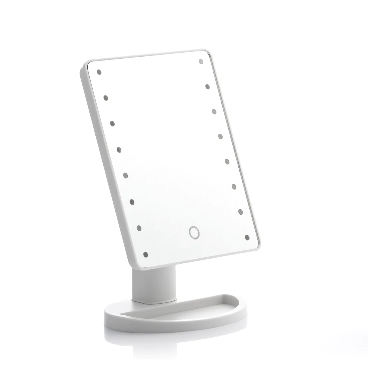 Oglinda de machiaj iluminată are un comutator ON/OFF, care este plasat pe spatele carcasei. Intensitatea luminii LED poate fi reglată cu butonul tactil care este plasat în partea inferioară a oglinzii - doar apăsați butonul pentru un moment și intensitatea luminii se va schimba ușor în intensitate.
