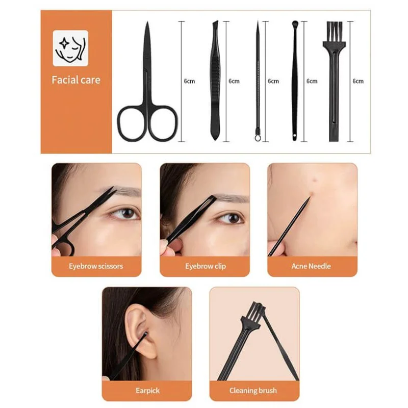 - Îngrijire facială:1 × foarfecă pentru sprâncene; 1 × clemă pentru sprâncene; 1 × ac de acnee; 1 × ac de ureche; 1 × perie;