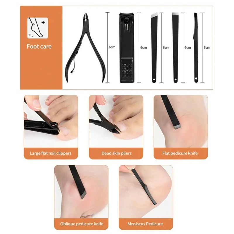 - Îngrijirea picioarelor: 1 × foarfecă de unghii mare și plată; 1 × clește pentru piele moartă; 1 × cuțit de pedichiură plat; 1 × cuțit de pedichiură oblic; 1 × răzuitor de piele moartă;